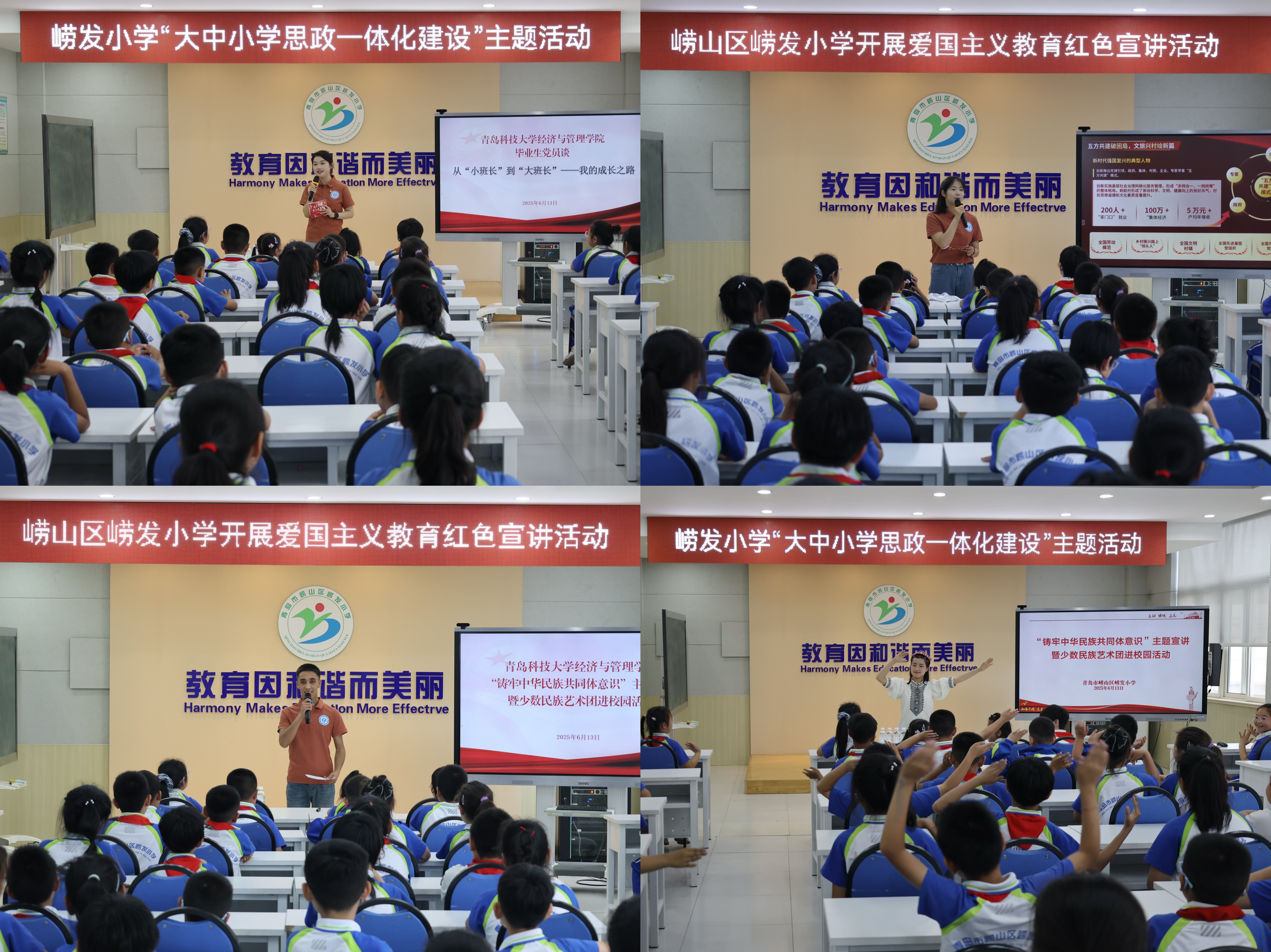 学生党员代表与崂发小学学生共同开展“大中小学思政一体化建设”主题活动。毕业生党员代表张一豪向小学生们分享了自己的成长故事,生动诠释了“入队、入团、入党”这一青年追求政治进步的“人生三部曲”,让现场的小学生们深受鼓舞。学院“润心宣讲团”代表吴嘉怡讲述了“从乡村热土到强国征程的奋斗故事”,并向小学生们延伸讲解了“先锋”的含义,号召大家向先锋榜样学习,不怕困难、勇敢前行,努力成长为能够担当民族复兴大任的时代新人。学院少数民族艺术团学生代表依克山·阿布拉提江和米娜瓦尔·艾依热提为小学生们开展铸牢中华民族共同体意识主题教育宣讲,通过故事讲述、舞蹈互动等形式让铸牢中华民族共同体意识在少年儿童心中生根发芽。活动现场气氛热烈,生动展现了党建引领下大中小学思政教育一体化的实践成果。