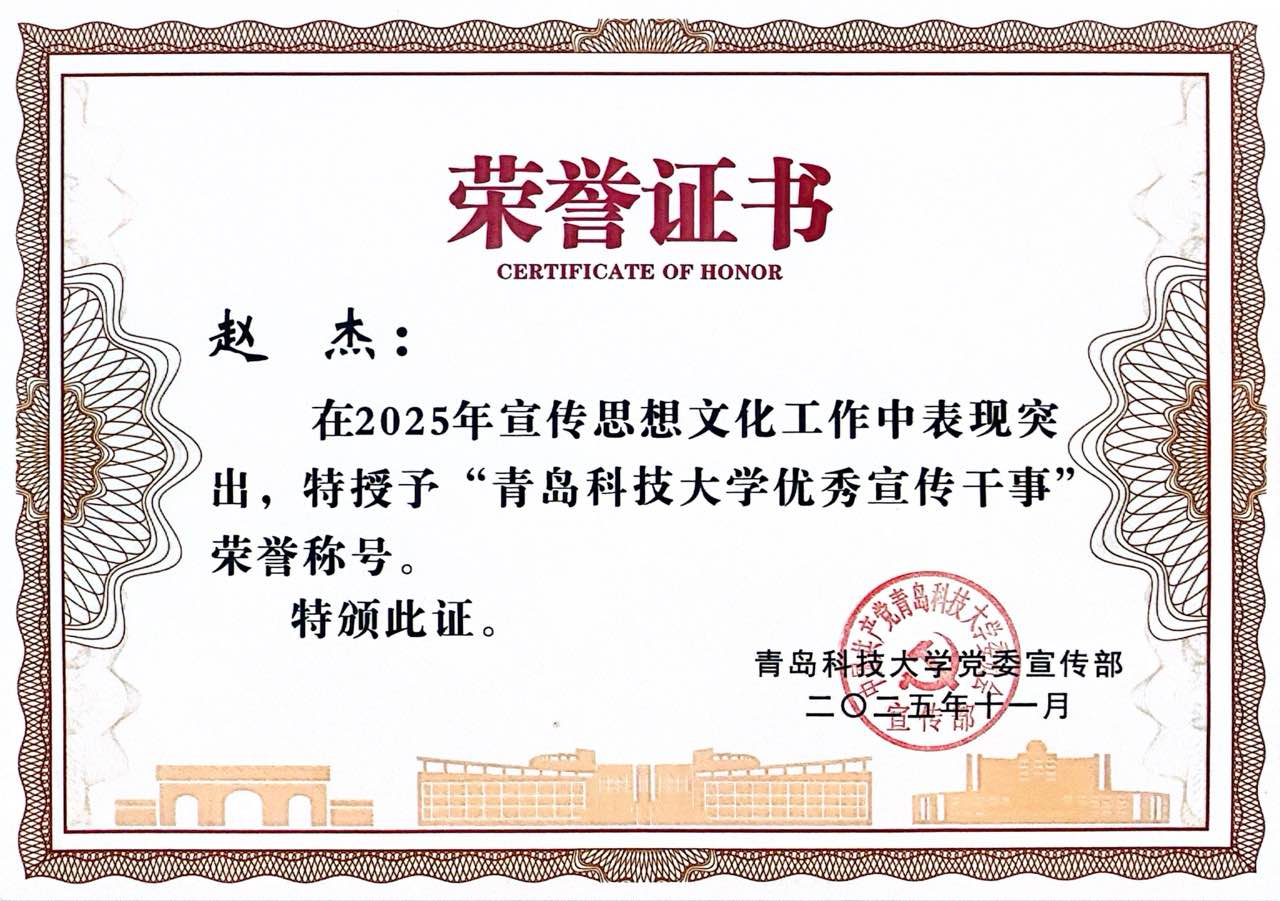 获评2025年新闻宣传先进单位、2025年优秀微信公众平台,学院教师赵杰获评2025年“优秀宣传干事”荣誉称号。