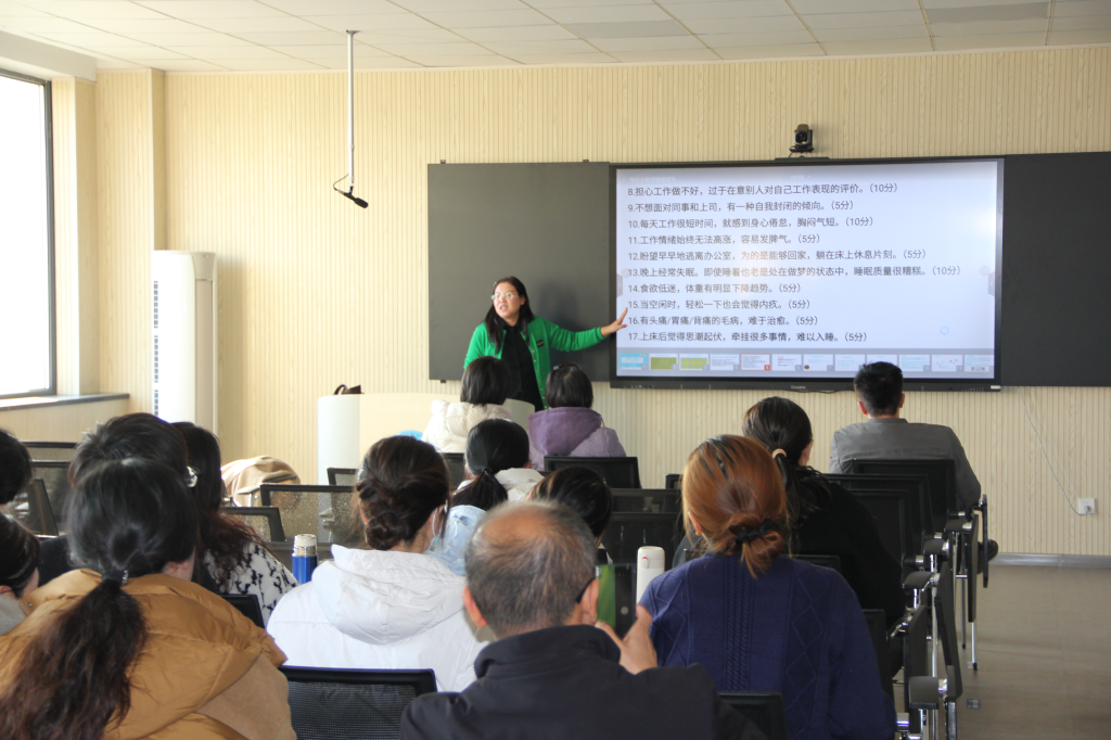 讲座伊始,米老师并未进行冗长的理论阐述,而是直接带领全体老师进行了一项简单的压力自测。几个贴近工作生活的问题,迅速引发了老师们的共鸣与思考,让大家对自身的压力状态有了初步的觉察。