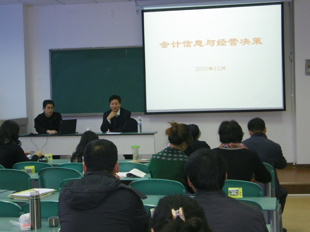 汤先生曾在山东大学管理学院任教,历任青岛海信电器股份有限公司总会计师副总经理总经理海信集团有限公司总裁助理副总裁青岛海信空调有限公司总经理,现任青岛海信空调有限公司副董事长青岛海信电器股份有限公司董事他给大家讲述了会计信息的特点会计信息与企业经营的关系以及如何利用好会计信息实施企业经营决策,多年的教学经历加上丰富的实践实验,使汤总的讲座语言睿智资料翔实逻辑紧密,从而最大程度的拓宽了同学们的视角和思维