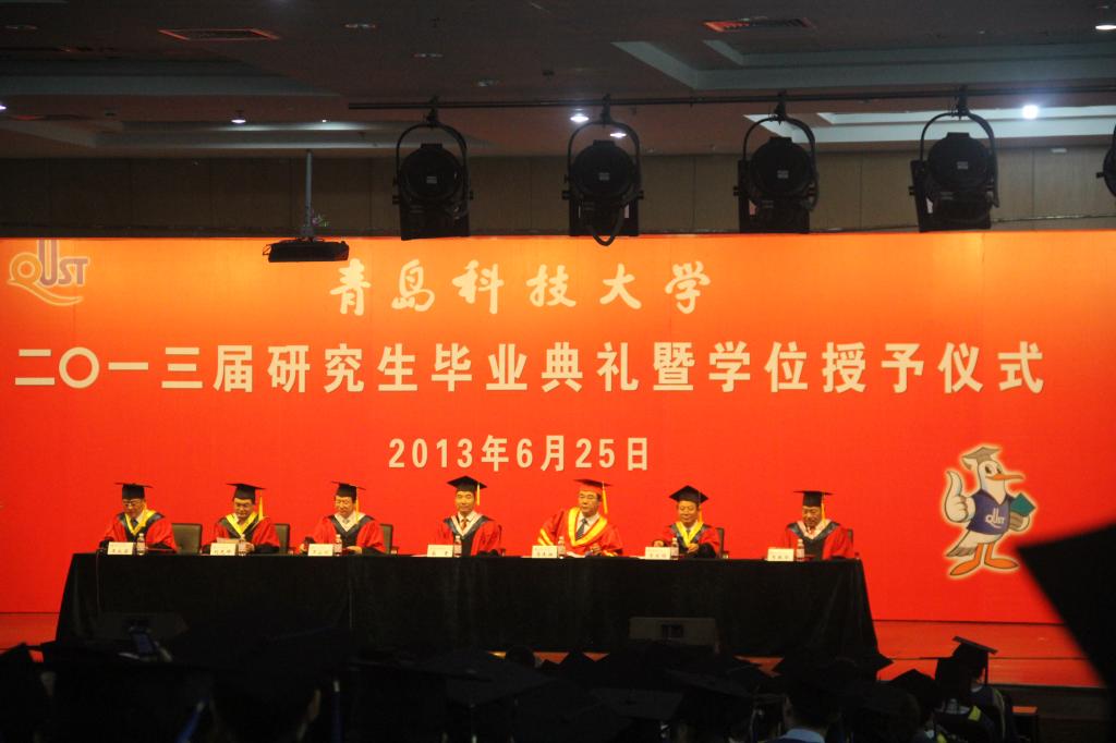 6月25日上午,青岛科技大学2013届研究生毕业典礼暨学位授予仪式在崂山校区第二报告厅隆重举行。校领导高青、马连湘、罗公利、李庆领、刘光烨、韦殿华出席典礼并在主席台就座,大会由研究生工作处处长王永岩主持。
