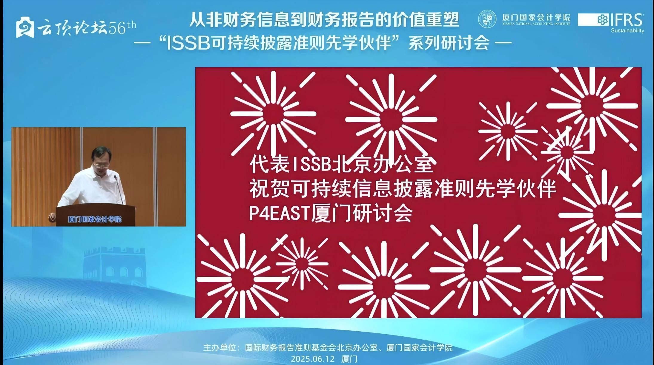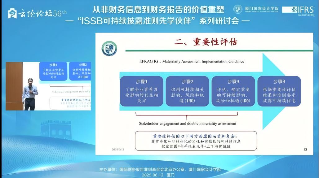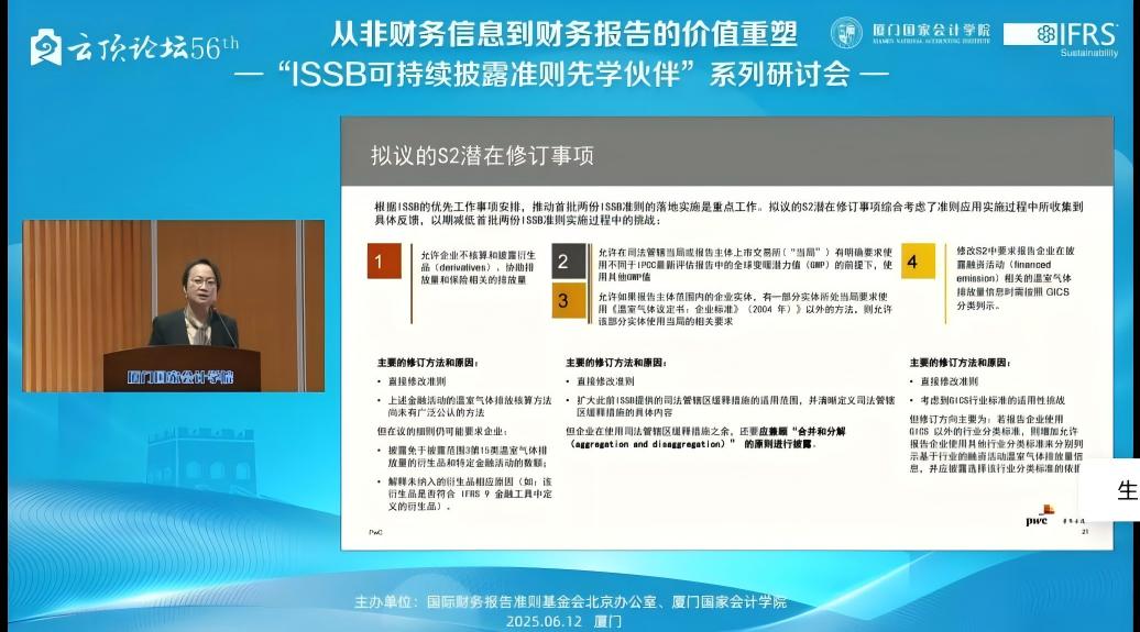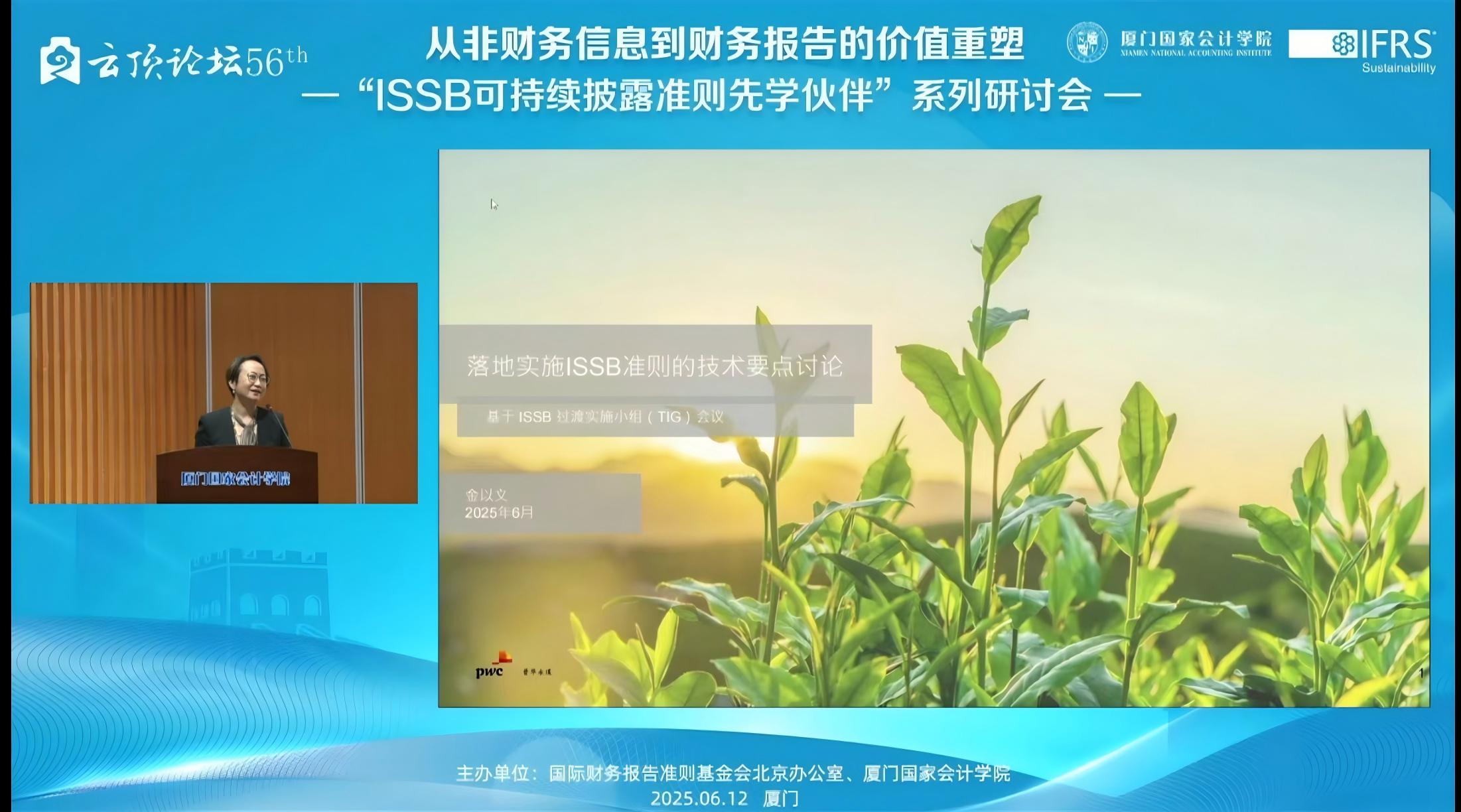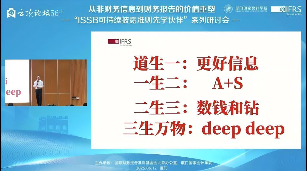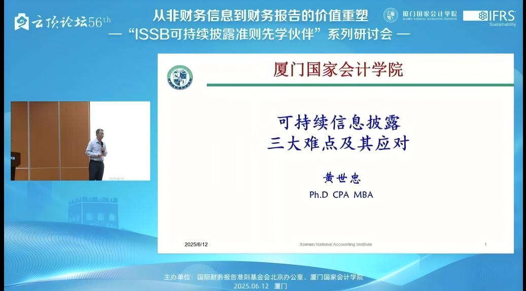 2025612日,下午1400——1715,由国际财务报告准则基金会北京办公室与厦门国家会计学院主办的,第56届云顶论坛:从非财务信息到财务报告的价值重塑——“ISSB可持续披露准则先学伙伴”厦门研讨会在厦门国家会计学院学术报告厅B区顺利举办。同时,我校MPAcc学生也通过厦门国家会计学院微信公众号的直播同步参与了该学术讲座。