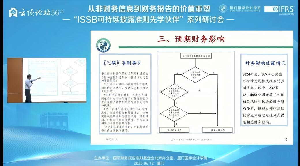 黄教授主要从国内外新进展、重要性评估、预期财务影响及范围3披露四个方面展开演讲。首先,从六大报告框架梳理了财务报告披露的发展框架,介绍了国内建设可持续披露准则和鉴证准则的两大准则体系情况。